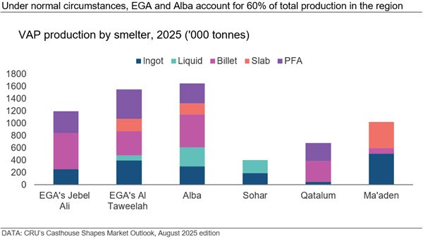 Together, the facilities represent roughly 4% of global aluminum and alumina capacity, according to Timna Tanners, managing director of equity research at Wells Fargo. Tanners said the attacks “rattle ali,” noting EGA’s “~1.6 MT/yr smelting, ~2.4 Mt/yr alumina” capacity and Alba’s “1.6 Mt/yr smelting.”